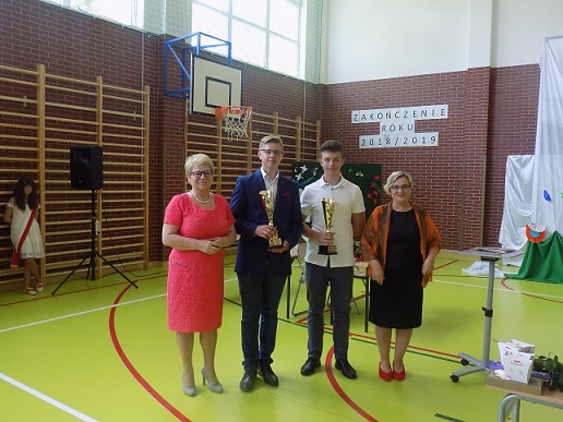 Za najwyższą średnią ocen w szkole dwóch uczniów naszej szkoły otrzymało Puchary: Alex Rusinek (5,72) i Szymon Stojanowski (5,72) z kl.VIII,które wręczyła im P.Ewa Szymańska-poseł na sejm RP.