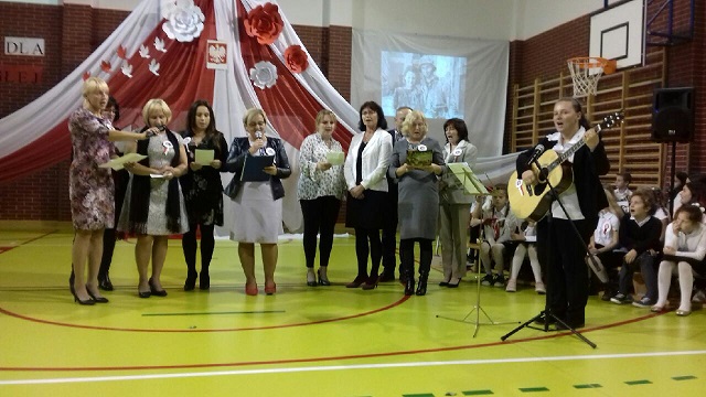O godzinie 1600 na pięknie przystrojonej przez grupę nauczycieli sali gimnastycznej naszej szkoły uczniowie, przybyli goście wraz z całą społecznością Szkoły odśpiewali hymn narodowy, a następnie kl.4 przedstawiła krótką inscenizację poświęconą rocznicy odzyskania przez Polskę niepodległości, którą przygotowali pod kierunkiem wychowawczyni p. Beaty Jachimowicz i nauczycielki języka polskiego-p. Sabiny Byszewskiej. Następnie prowadzący koncert powitali przybyłych gości i zaprosili do wspólnego śpiewania. Pieśni patriotyczne wykonali uczniowie każdej klasy uczącej się w naszej szkole. Przygotowywali się oni pod czujnym okiem wychowawców, którzy zadbali o dobór repertuaru oraz jego wykonanie. Muzyczną oprawą zajęła się p. Agnieszka Orawiec-nauczyciel muzyki. Aby zadowolić słuchaczy i spędzić więcej czasu razem występy przygotowali również pojedynczy reprezentanci klas oraz chór szkolny. Miło nam było usłyszeć,że przybyli goście i mieszkańcy naszych miejscowości śpiewają wszystkie pieśni wraz z występującymi. Słowa pieśni i wizualizacje do nich wyświetlały panie B.Jachimowicz i B.Zawrotniak,która je wcześniej przygotowała. Usłyszeliśmy także jedną z pieśni w wykonaniu sołtys wsi Wykroty p.Krystyny Proć w duecie z p.Wandą Słabicką. Natomiast pod koniec uroczystości utwór ,,Po ten kwiat czerwony” wykonała p.Wiesława Traczyk-dyrektor szkoły,a na koniec piękną pieśń Sławy Przybylskiej ,,Gdzie są kwiaty z tamtych lat?”zaśpiewała większość grona pedagogicznego szkoły.