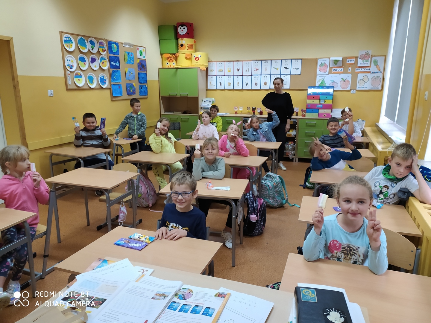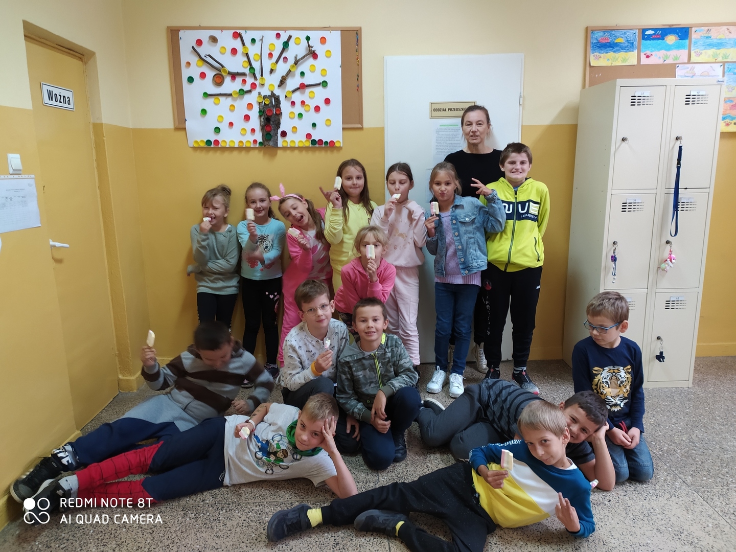 Dnia 30 września wszyscy uczniowie otrzymali łakocie. Dzieci są bardzo uradowane z niespodzianki, którą przygotowali rodzice. Ze smakiem zajadają smakołyki i składają podziękowania pani Oli, za to, że zechciała przynieść im do klasy te pyszne prezenty.