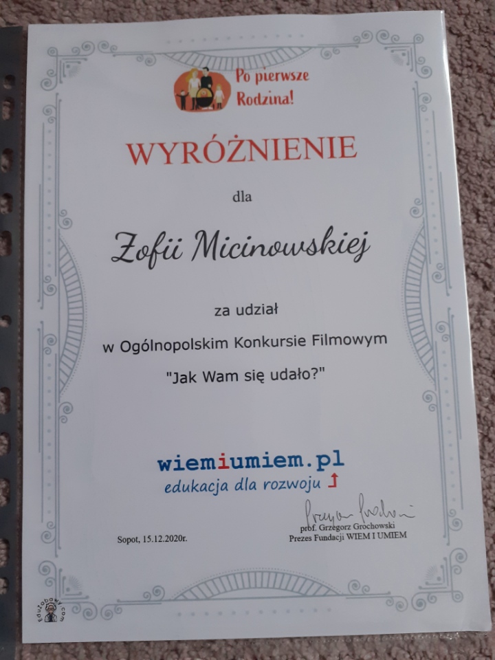 W grudniu 2020 r nasza uczennica z klasy VII A Zofia Micinowska uczestniczyła w ogólnopolskim konkursie filmowym „Jak Wam się udało?”, który realizowany był w ramach projektu wsparcia więzi rodzinnych oraz promocji macierzyństwa „Po pierwsze Rodzina!”. Finansowany przez Ministerstwo Rodziny, Pracy i Polityki Społecznej. Organizatorem konkursu była Fundacja WIEM I UMIEM.