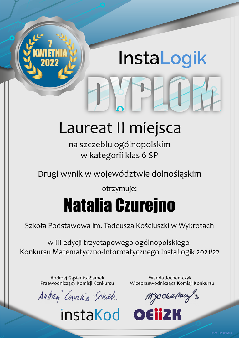 Natalia Czurejno z kl. VI nie tylko zakwalifikowała się do III etapu, ale została laureatem II miejsca na szczeblu ogólnopolskim.
