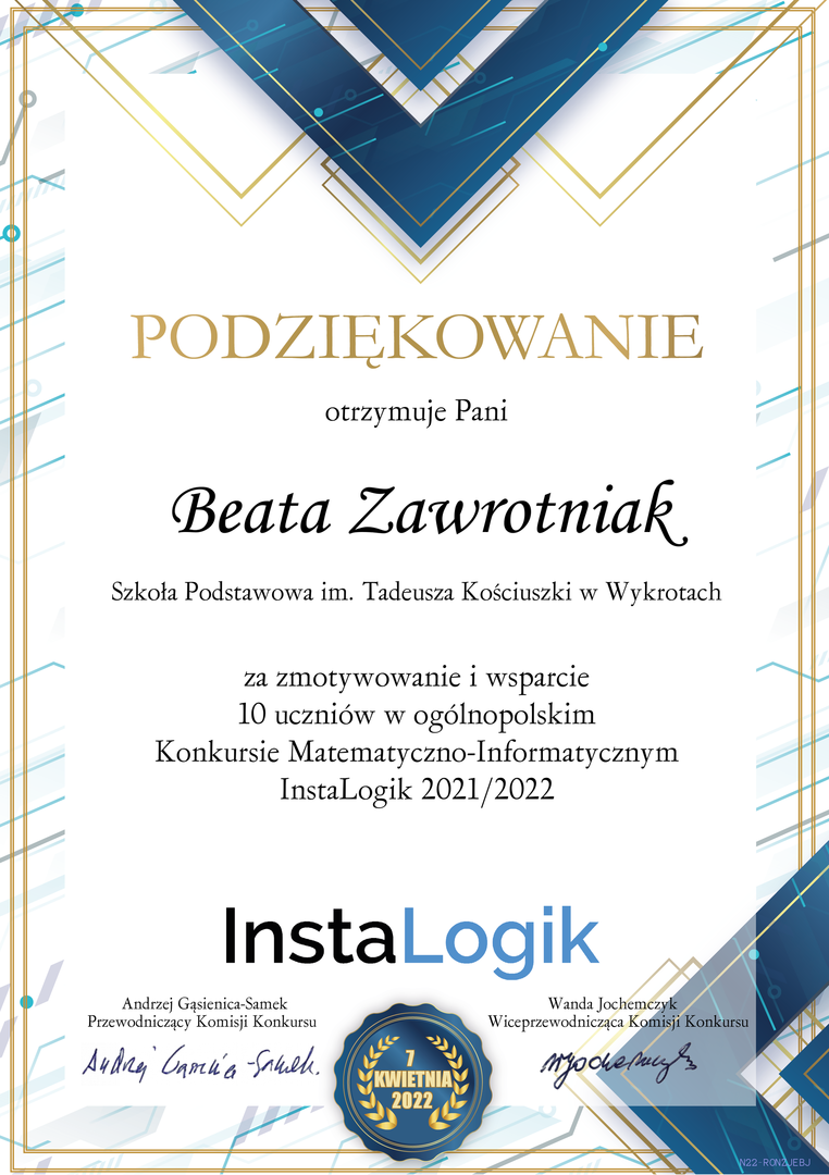 Z naszej szkoły do konkursu przystąpili: Aleksander Nowak(kl. IV), Jan Obrycki kl.V), Milena Nitarska (kl. V), Mateusz Rudko (kl. V), Natalia Czurejno (kl. VI) Fabian Dorożyński (kl. VIII A), Antoni Sałek (kl. VIII A), Dominik Filistyński (kl. VIII B), Martyna Zasańska (kl. VIII B), Rafał Gola(kl. VIII B) .