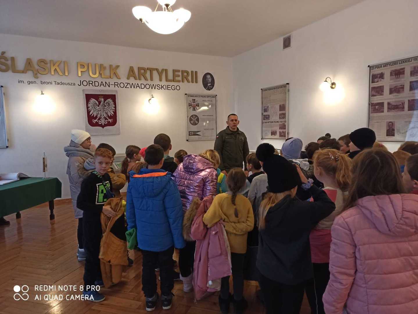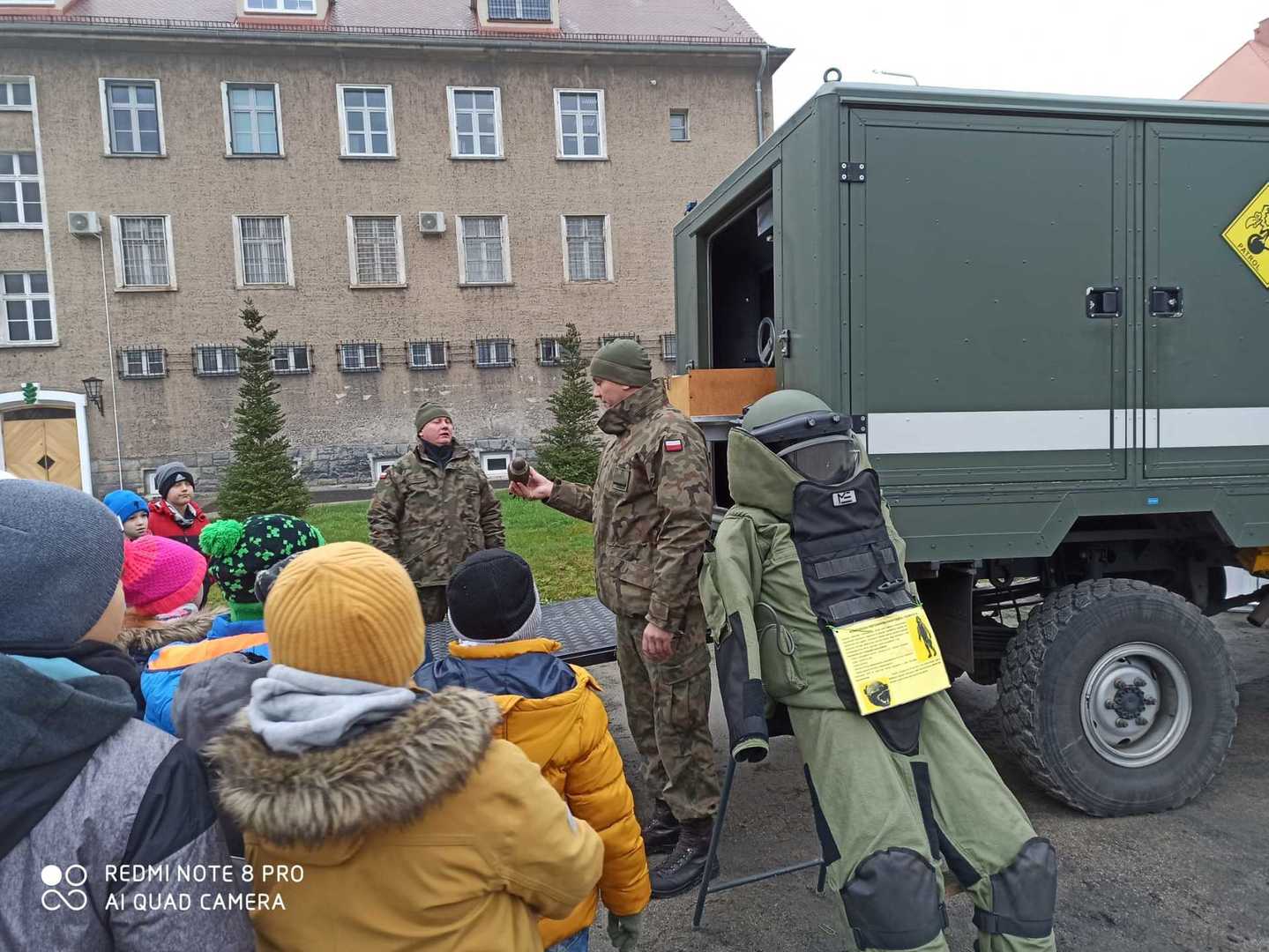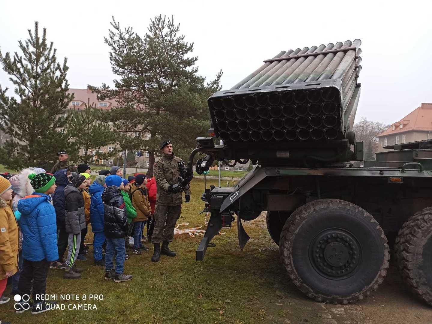 Dnia 5 grudnia uczniowie klasy II i III wraz z wychowawcami p. U. Bendkowską i p. I. Smolińską oraz p. R. Bafeltowską uczestniczyli w wycieczce do Bolesławca do Jednostki Wojskowej. Zwiedzili koszary, zapoznali sie ze sptrzętem wojskowym, obejrzeli wozy bojowe i pancerne. W sali kinowej byli na seansie filmu o działaniach wojska na poligonie. Wizytę w jednostce zakończono pamiątkowym zdjęciem.