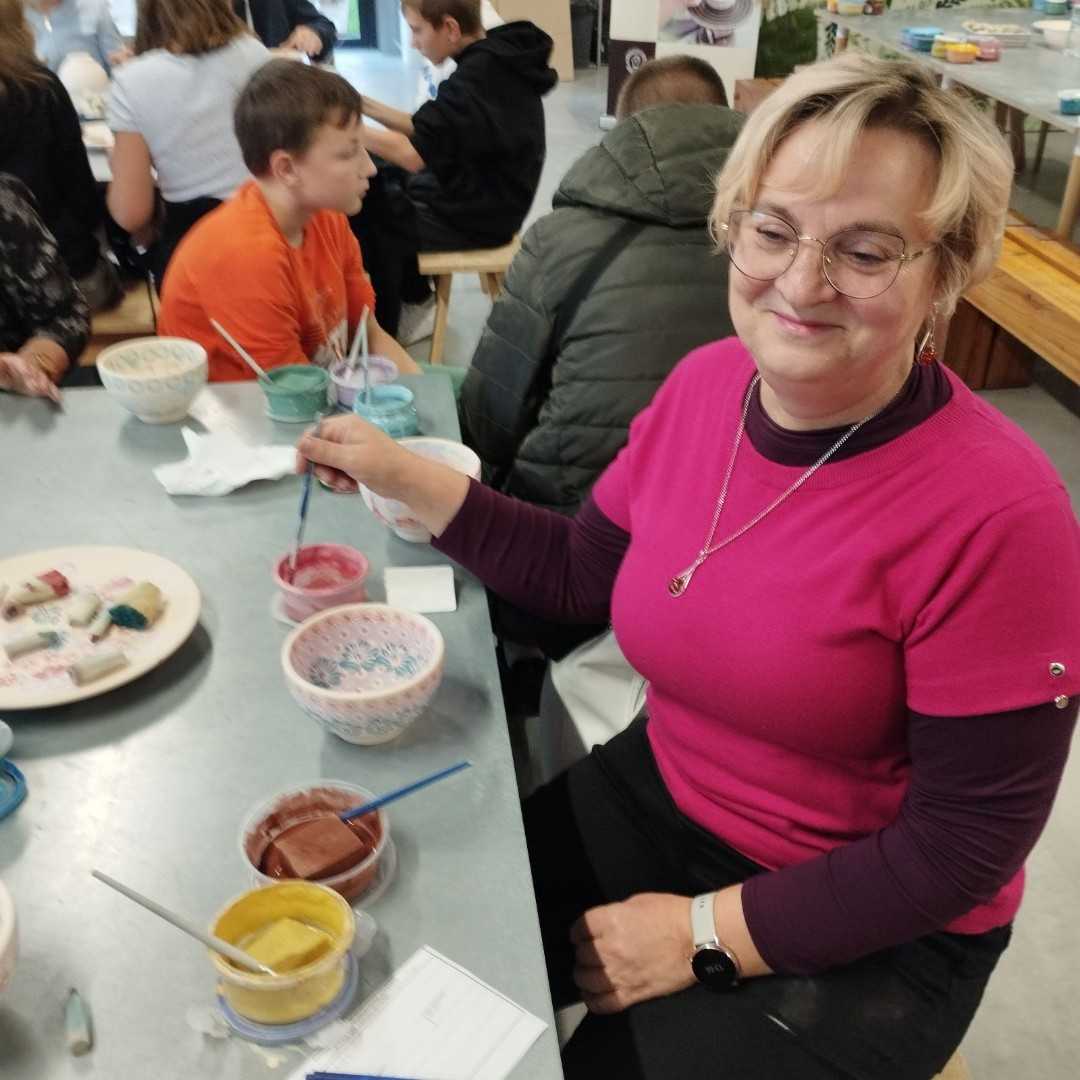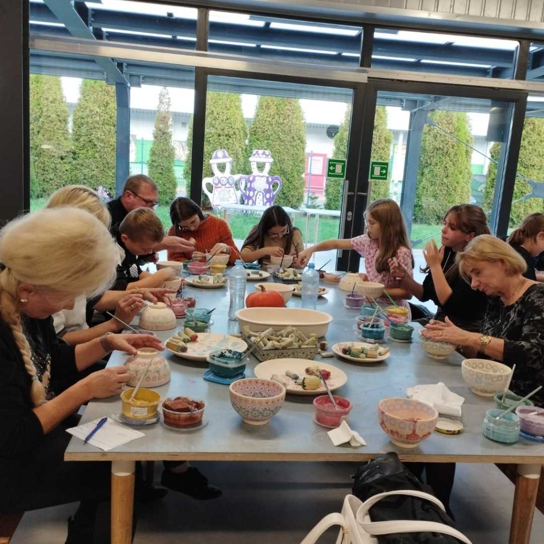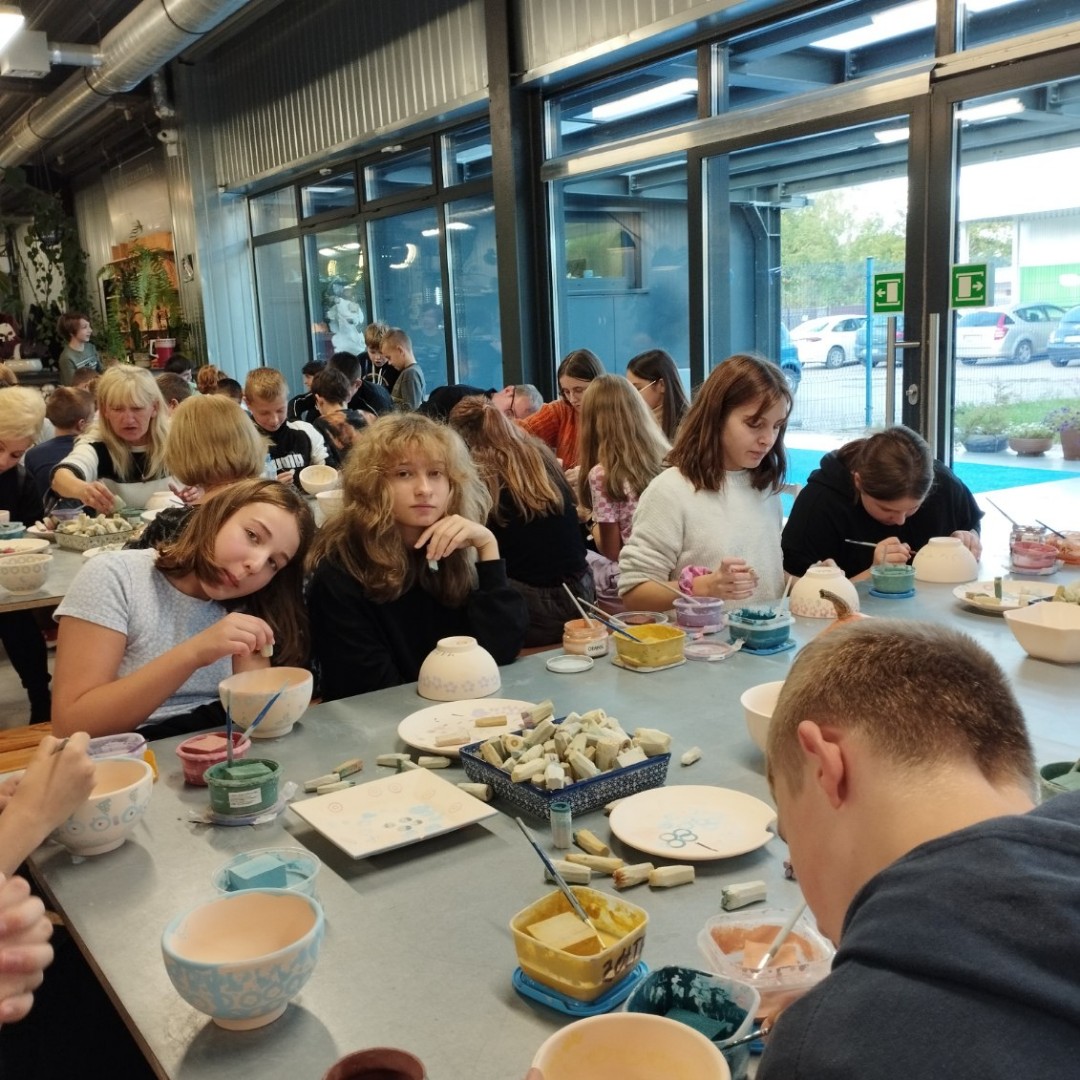 Po zwiedzaniu wszyscy uczniowie wraz z opiekunami uczestniczyli w warsztatach, gdzie własnoręcznie malowali miski. Zaangażowanie w wykonanie pracy było bardzo duże . wszystkie prace uczniowie otrzymają na pamiątkę po zakończeniu procesu szkliwienia wypalania.