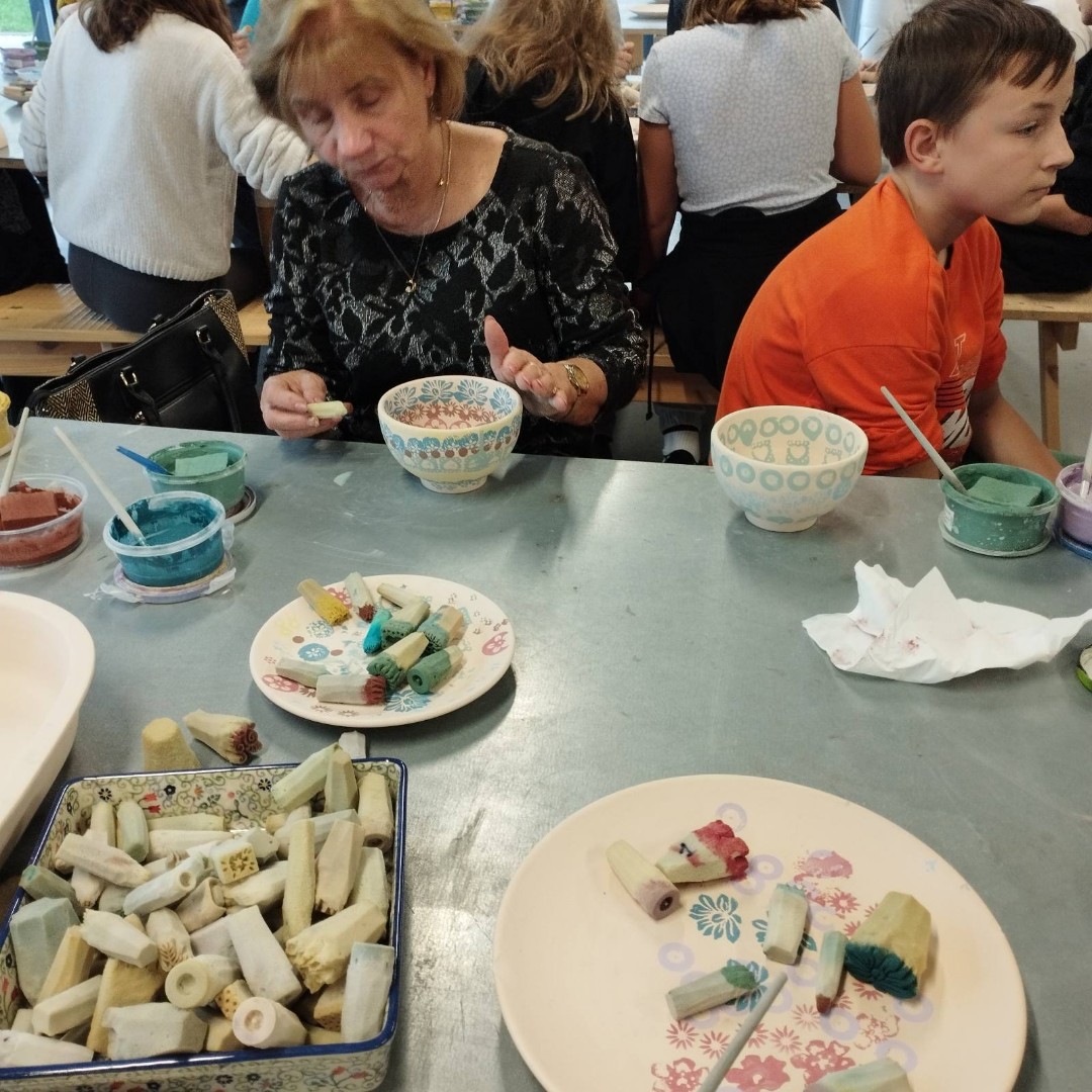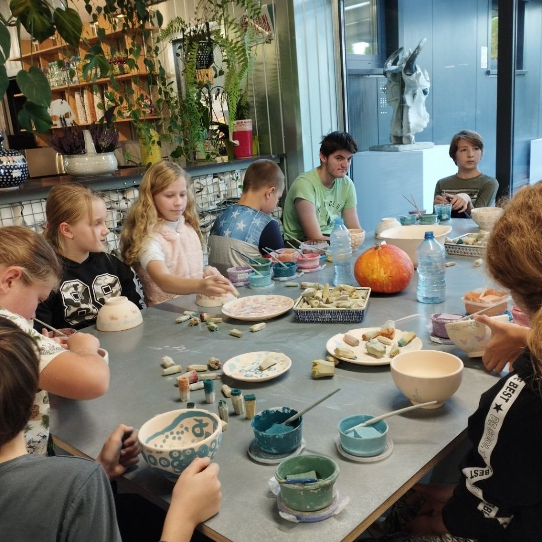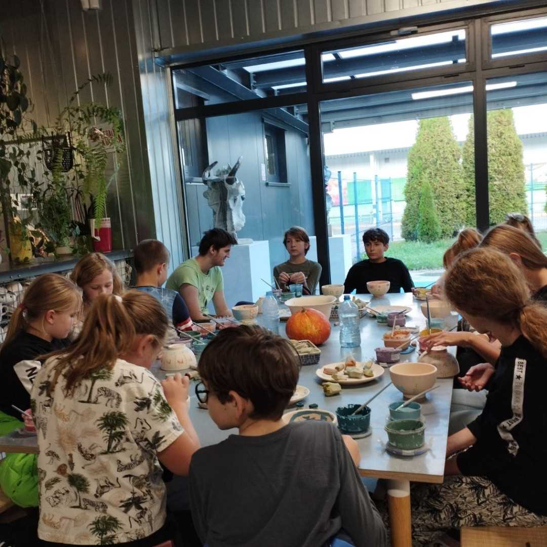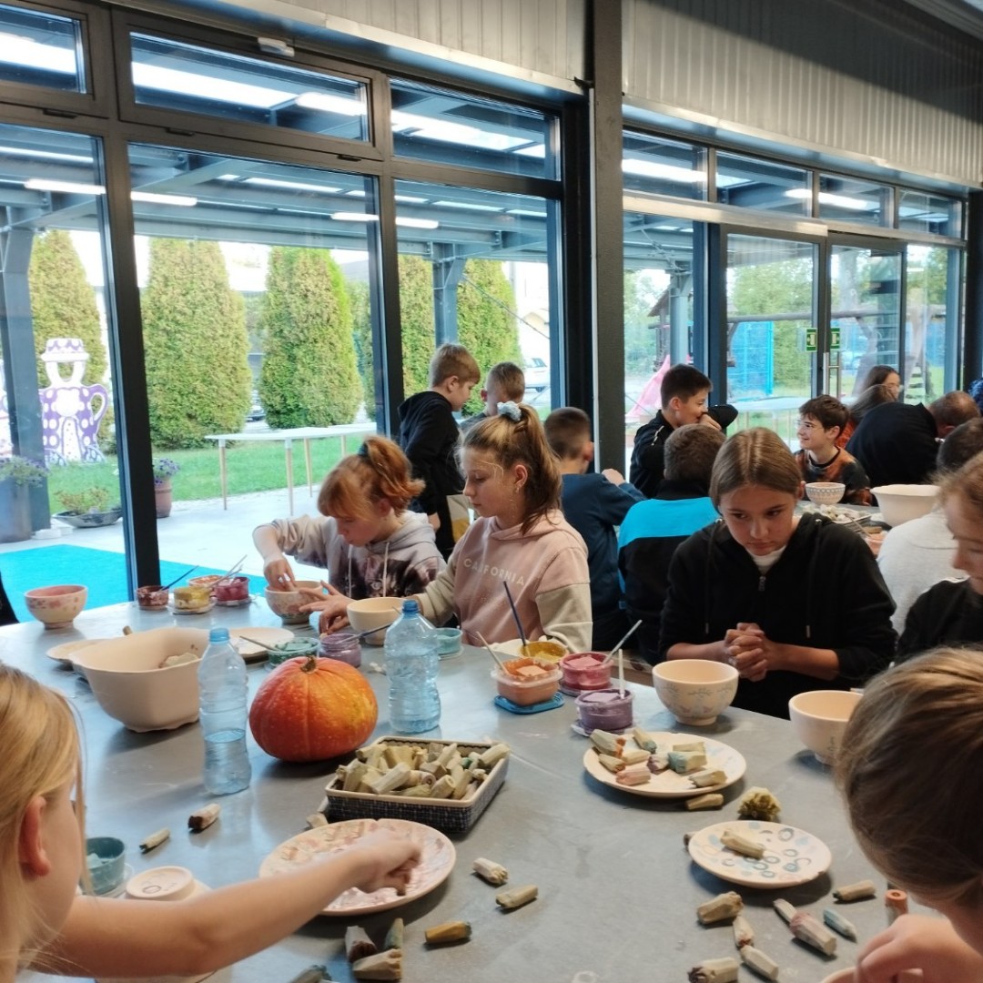 Po zwiedzaniu wszyscy uczniowie wraz z opiekunami uczestniczyli w warsztatach, gdzie własnoręcznie malowali miski. Zaangażowanie w wykonanie pracy było bardzo duże . wszystkie prace uczniowie otrzymają na pamiątkę po zakończeniu procesu szkliwienia wypalania.