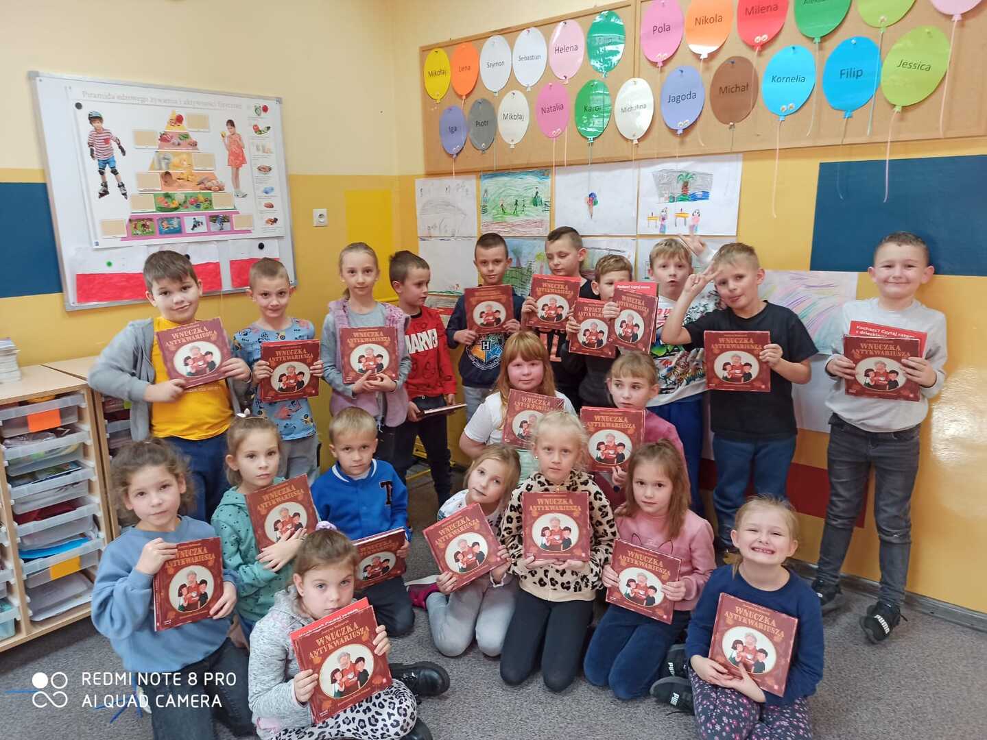 Nasza szkoła bierze udział w ogólnopolskim Projekcie Instytutu Książki ,,Mała książka - wielki człowiek". Z tej okazji dnia 13.11.2023r. pani Dyrektor W. Traczyk wręczyła uczniom klasy pierwszej książki wraz z poradnikiem dla rodziców. Ta kampania społeczna pokazuje niezwykle ważną rolę książek w życiu dzieci. Jednym z jej elementów są działania na rzecz najmłodszych uczniów, aby ich zachęcić do częstego sięgania po książki i regularnego czytania, zarówno samodzielnego, jak i z udziałem najbliższych. Mamy nadzieję, że chęć i zapał do czytania będzie towarzyszyć uczniom na co dzień.