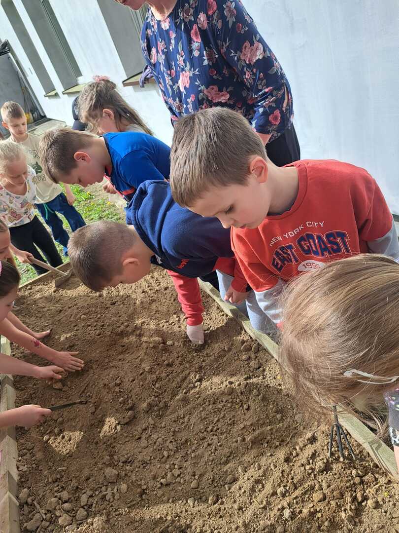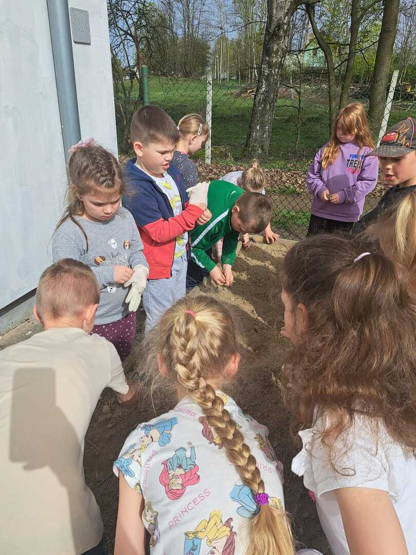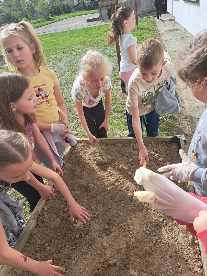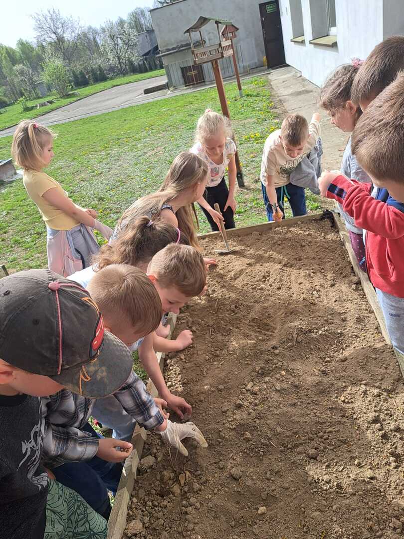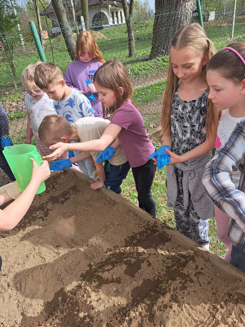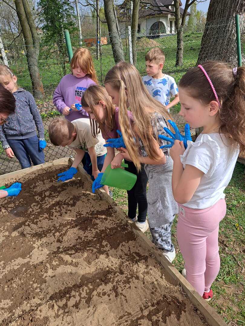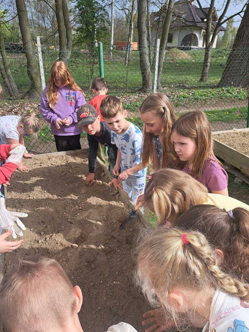 Dnia 8 kwietnia uczniowie klasy I założyli swój ogródek i posiali w nim nasionka warzyw. Teraz będą go pielęgnować, aby z nasion wyrosły piękne i zdrowe warzywa.